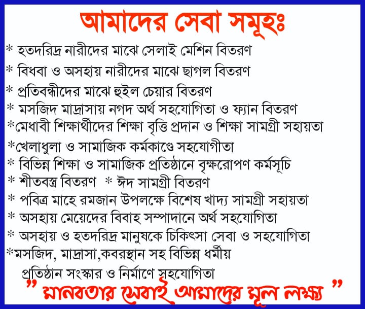 আমাদের কাজে উৎসাহ দিতে অর্থনৈতিক সহযোগিতা পাঠাতে পারেন -You can send financial support to encourage our work সিরাজগঞ্জের ডিসি সহ গণ্যমান্য ব্যক্তিবর্গের হাতে রাবেয়া ফাউন্ডেশন এর বার্ষিক ম্যাগাজিন ঈদ উল আযহা পরবর্তী বিভিন্ন খাতে নগদ অর্থ বিতরণ কার্যক্রম ২০২৫ নোটিশ ০৮/০৬/২০২৫ পবিত্র মাহে রমজান এবং পবিত্র ঈদ উল ফিতর উপলক্ষে প্রতিবন্ধীদের মাঝে হুইল চেয়ার ও নগদ অর্থ সহায়তা প্রদান পবিত্র ঈদ উল ফিতর উপলক্ষে “ঈদ সামগ্রী ” বিতরণ -২০২৫ অনলাইন মিটিং – উপদেষ্টা পরিষদ ও কার্যকরী কমিটি বসুন্ধরা কর্পোরেট ব্যাডমিন্টন টুর্নামেন্ট -২০২৫ মাহে রমজান ২০২৫ উপলক্ষে কাজিপুর পূর্বাঞ্চলের ২০ মসজিদে বৈদ্যুতিক ফ্যান বিতরণ সেলাই মেশিন বিতরণ – ফেব্রুয়ারী (২০২৫)
